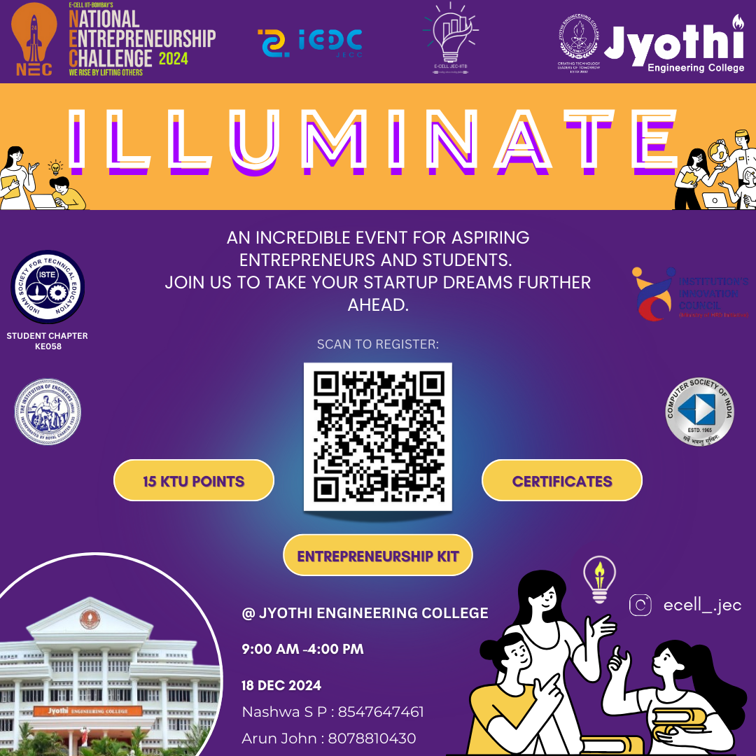 The Illuminate Workshop, organized by E-Cell Jyothi Engineering College in collaboration with E-Cell IIT Bombay and IEDC, proudly sponsored by CSI, IEI and ISTE of Jyothi Engineering College, was held on 18th December 2024 to foster entrepreneurial skills and ignite a passion for innovation among students. The event was made possible through sponsorship support from CSI, IEI, ISTE, and IEDC which enabled us to enhance the overall participant experience.The workshop featured engaging sessions led by experienced entrepreneurs and startup experts who provided valuable insights into business modelling, startup ideation, and problem-solving strategies. ILLUMINATE Participants enjoyed a full-day interactive program, which included hands-on activities such as business model canvas exercises, case studies, and networking opportunities with the speaker and mentors. Each attendee received a startup kit, lunch, and a certificate of participation from E-Cell IIT Bombay, enhancing the workshop experience.