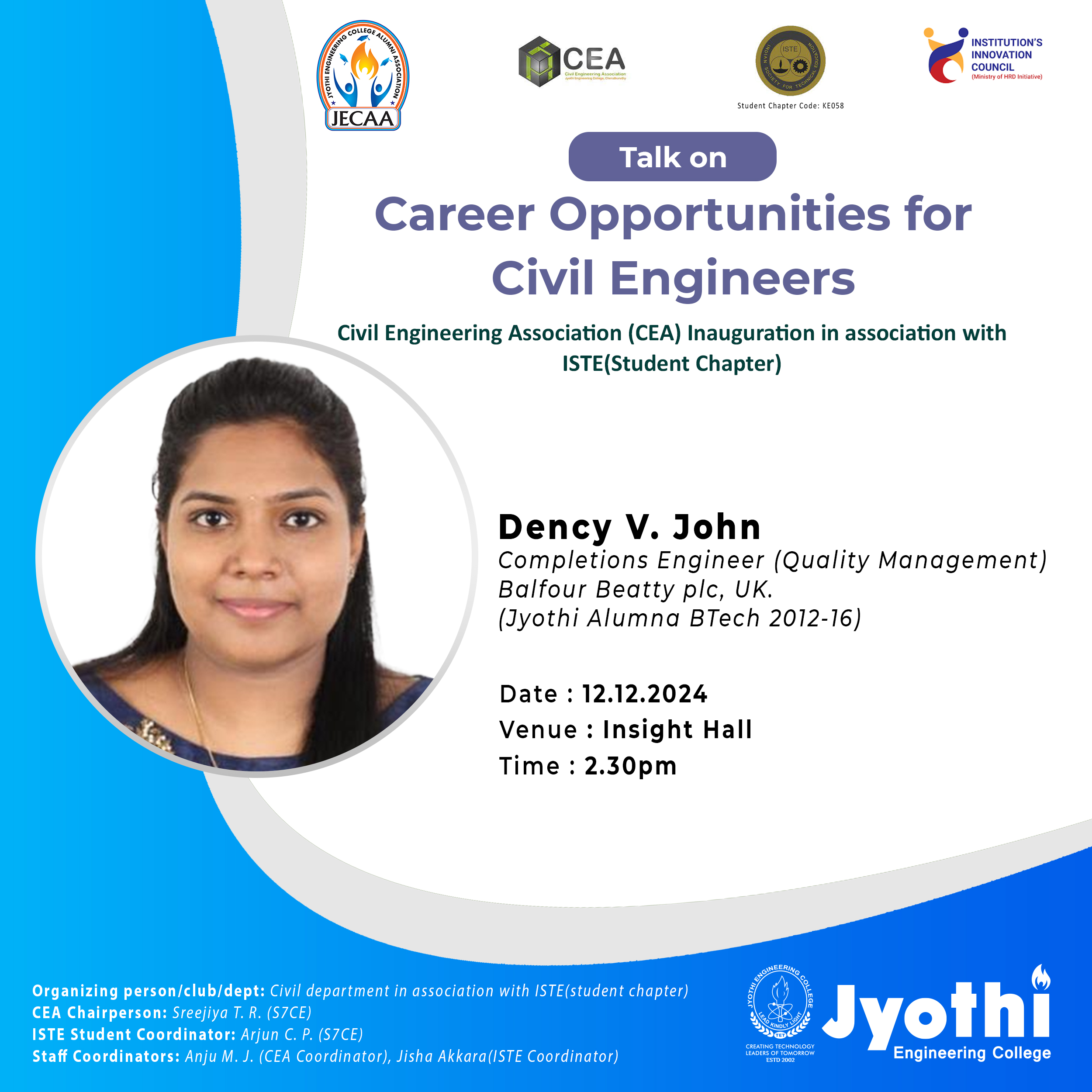 The Department of Civil Engineering, in association with the ISTE Student Chapter and the Civil Engineering Association (CEA), organized an insightful invited talk on Career Opportunities for Civil Engineers. Resource Person: Ms. Dency V. John Completions Engineer (Quality Management) at Balfour Beatty plc, UK.